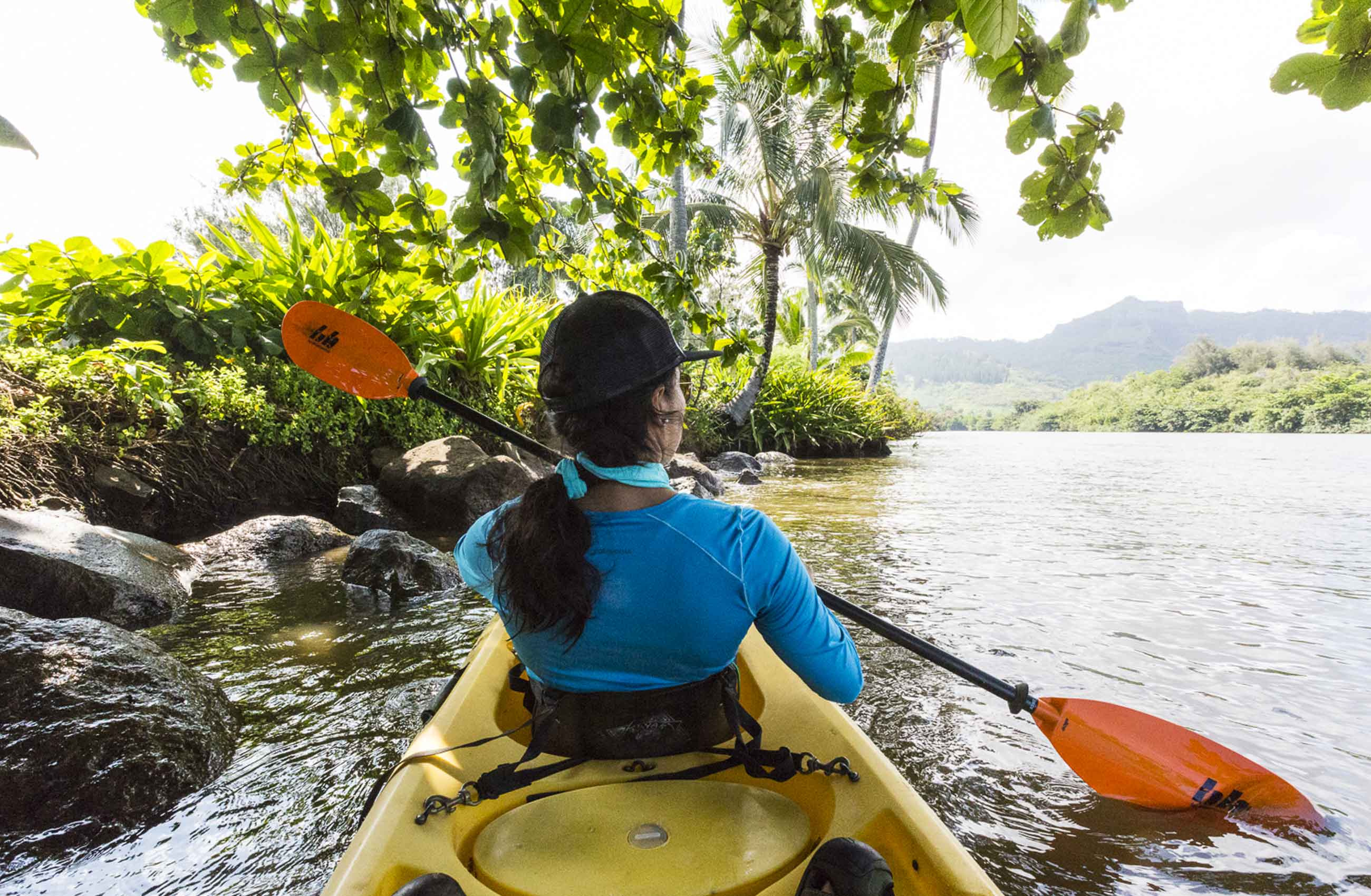 Secret Falls, also known as Sacred Falls (Uluwehi Falls), is a tropical paradise situated along the Wailua River. The trailhead is only accessible by water, so grab a paddle and kayak on the peaceful Wailua River as you make your way to the start of the hike. You have two options: you can rent a kayak and explore on your own, or book a tour that includes a guided hike to the waterfall. This is definitely an activity for nature lovers. The paddle takes you through dense tropical vegetation, and leads you into the beautiful jungle of Kauai. The trail is 6.1 miles out and back, and only a 465 foot elevation gain. It is easily completed by hikers of various skill levels, including children.